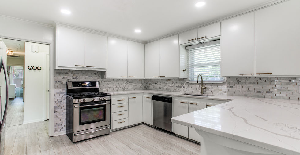 New backsplash and kitchen counters punctuate the stunningly revamped kitchen